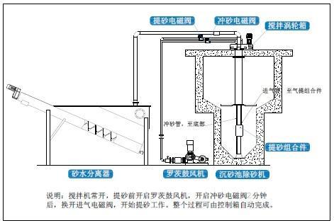 由于葉輪葉漿向上傾斜,旋轉(zhuǎn)時(shí)將使池中的污水呈螺旋狀加速,形成渦流態(tài),產(chǎn)生留心力。同時(shí)池內(nèi)污水流在葉輪葉片攪拌剪切力的作用下,互相剝離,依靠砂的自身重力和旋流的離心力,使砂粒沿池壁呈螺旋線加速沉降,向中心砂斗積聚,經(jīng)氣提或泵提升后排出池外作進(jìn)一步的處理。在此過(guò)程中,適當(dāng)?shù)臉~角度和線速度條件,使污水中的砂粒受到?jīng)_刷,并保持好的沉降效果,而原來(lái)粘附在砂粒上的有機(jī)物,以及重量其它小的物質(zhì),隨污水一同流出旋流沉砂池,進(jìn)入后續(xù)工序繼續(xù)處理,砂與少量污水進(jìn)入池外砂水分離器內(nèi),砂經(jīng)分離后外排,污水回流至格柵井。